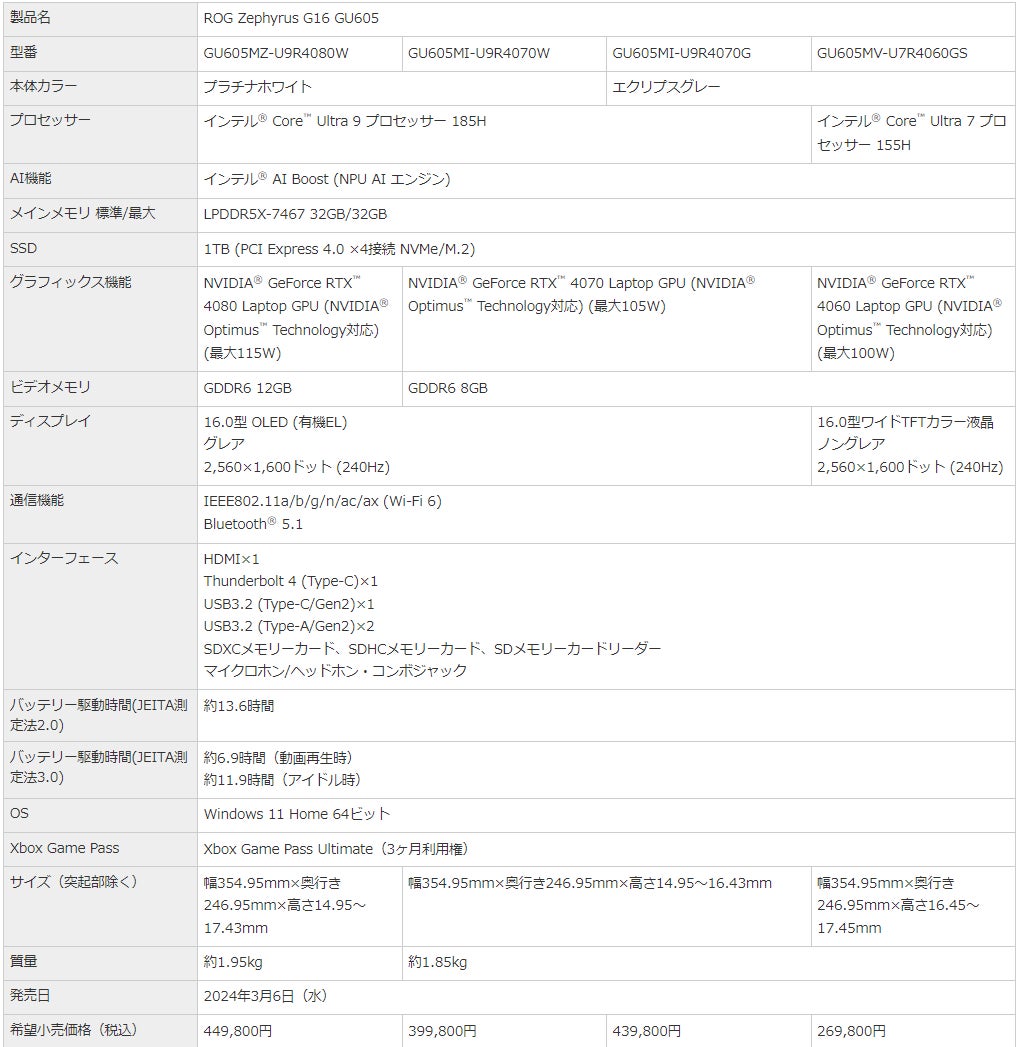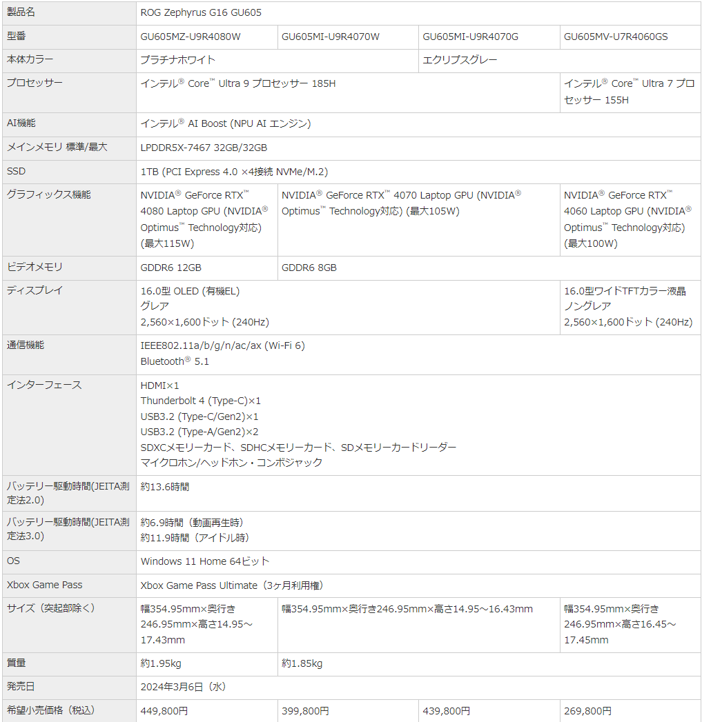 製品詳細:https://rog.asus.com/jp/laptops/rog-zephyrus/rog-zephyrus-g16-2024/