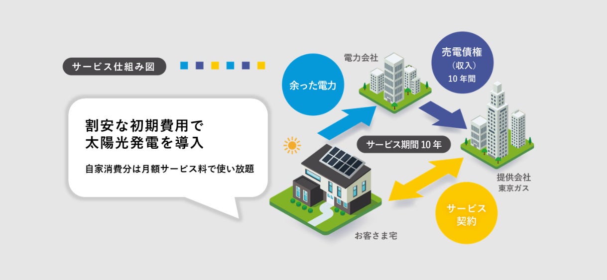お客さま宅に割安な初期費用で太陽光発電を導入し、サービス期間中は余剰電力の売電収入を東京ガスがいただくことで、割安な定額料金にて太陽光発電をご利用いただけるサービスです。詳細はこちら。
