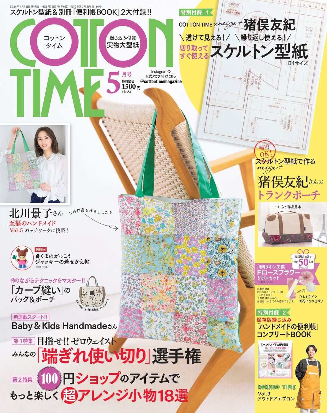 隔月刊手芸雑誌『COTTON TIME』にて、「北川景子さんの至福のハンドメイド」を連載中の北川さん。4月7日発売の最新号では、初夏に映える、グリーンリーフのパッチワークトートを作りました。