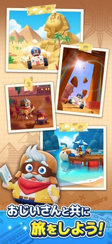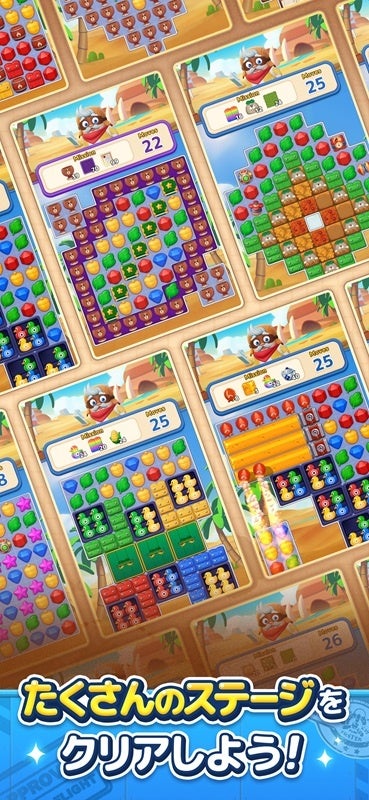 パズルをプレイしてステージをクリアするとワールドマップが進行。"旅の記録(ホームイラスト)"が変わりフランクの旅を一緒に楽しむことができます。フランクが魔法のカバン君“ポチ”と出会って始める旅路を楽しんでください。さまざまなワールドを旅した先に、果たしてフランクの憧れ「シークレット島」までたどり着けるのか!?