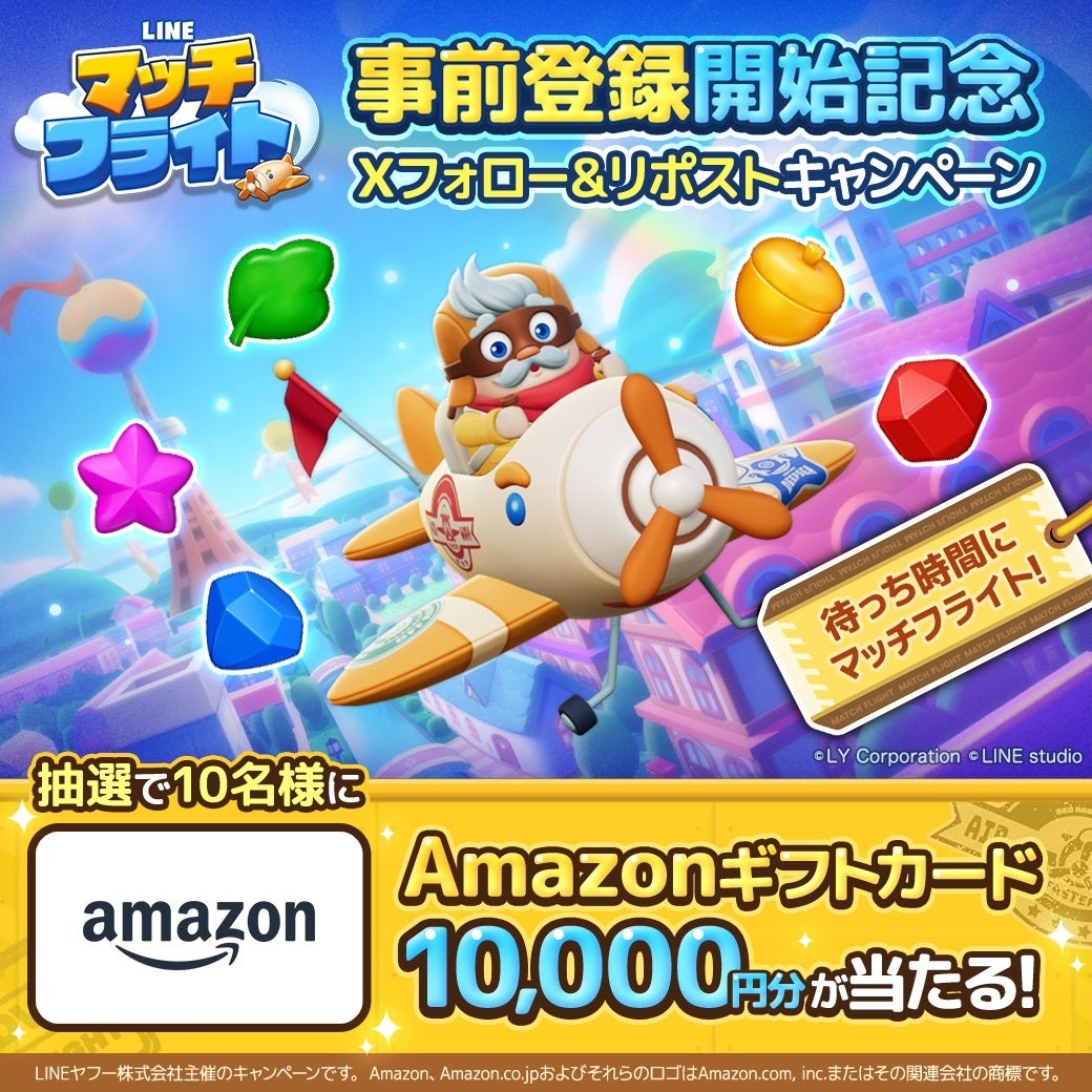 事前登録の期間中に「LINE マッチフライト」公式X(旧Twitter)アカウント(https://x.com/L_matchflight_j)をフォローして、対象の投稿をリポストすることで抽選で10名様にAmazonギフトカード10,000円分が当たります。