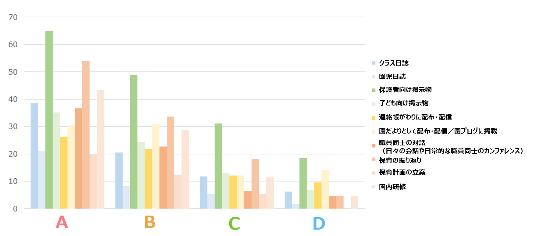 一方で、この「ドキュメンテーション」の活用については、「保護者への活動報告」としての活用にとどまり、本来の子どもの思いを「記録」し、保育を考えていく方向での活用を十分にできていない園が多いこともわかりました。保護者向けの掲示物だけではなく、クラス日誌や連絡帳などの他の書類としても活用するには、ICTの活用などを通して「業務の追加」ではなく「業務の置き換え」を行うことが重要であると考えられます。