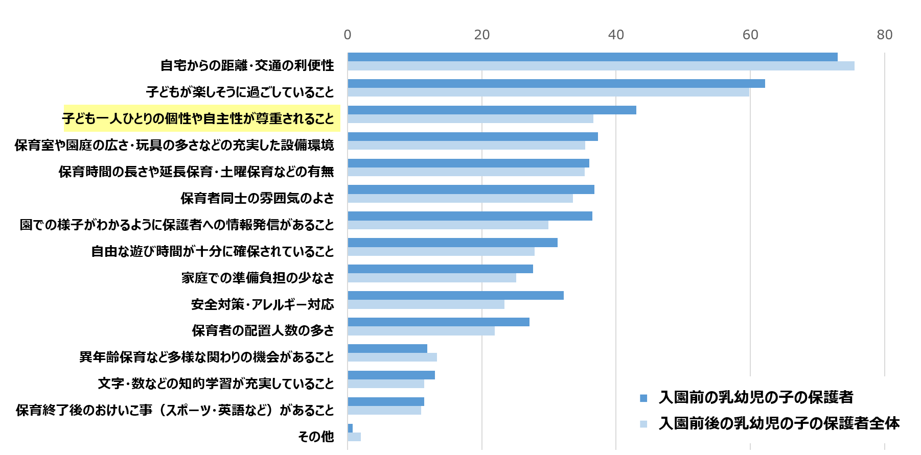 保護者が園選びの基準として重視するのは「地の利」「子どもが楽しそうに過ごしていること」に次いで、「一人ひとりの個性や自主性の尊重」であることが明らかになりました。