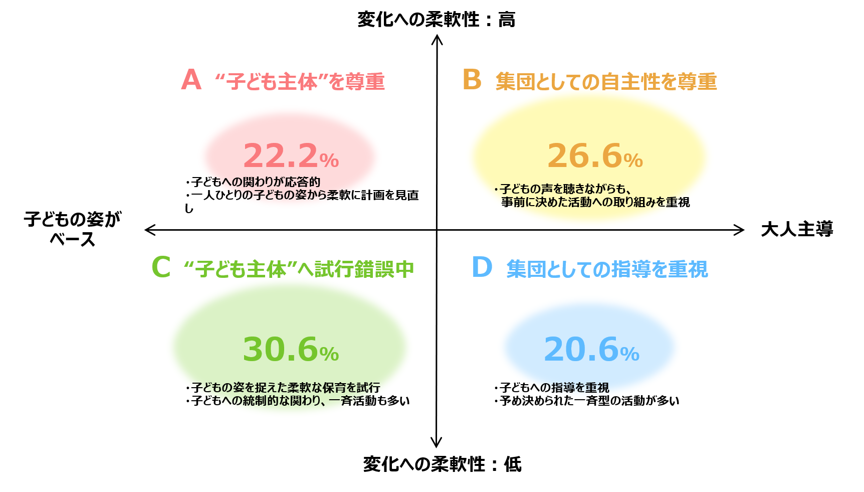 「子ども主体」の実現度を測るにあたり、「変化への柔軟性」と「保育内容が大人主導か子どもの姿ベースか」の2点が重要な評価指標となり、4つのグループに分類できることがわかりました。