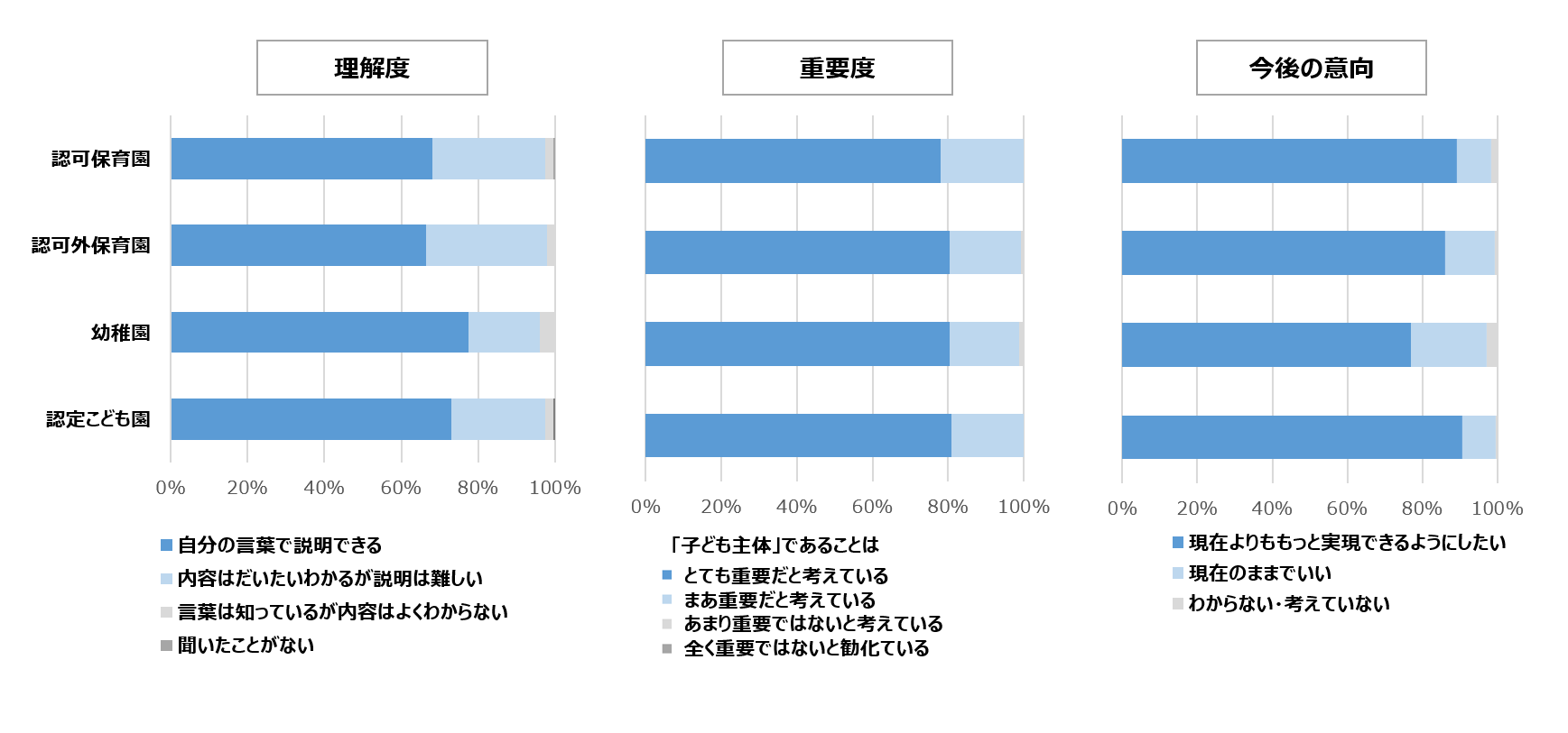 「子ども主体の保育」を「自分の言葉で説明できる」という園は7割程度にとどまりましたが、保育が“子ども主体であること”について、99.7%が「重要である」と考えていることがわかりました。なお、この結果は保育園・幼稚園・こども園の種別を問わず、ほぼ同様の結果となり、園種を超えて「子ども主体」の重要性が認識されていることが明らかになりました。