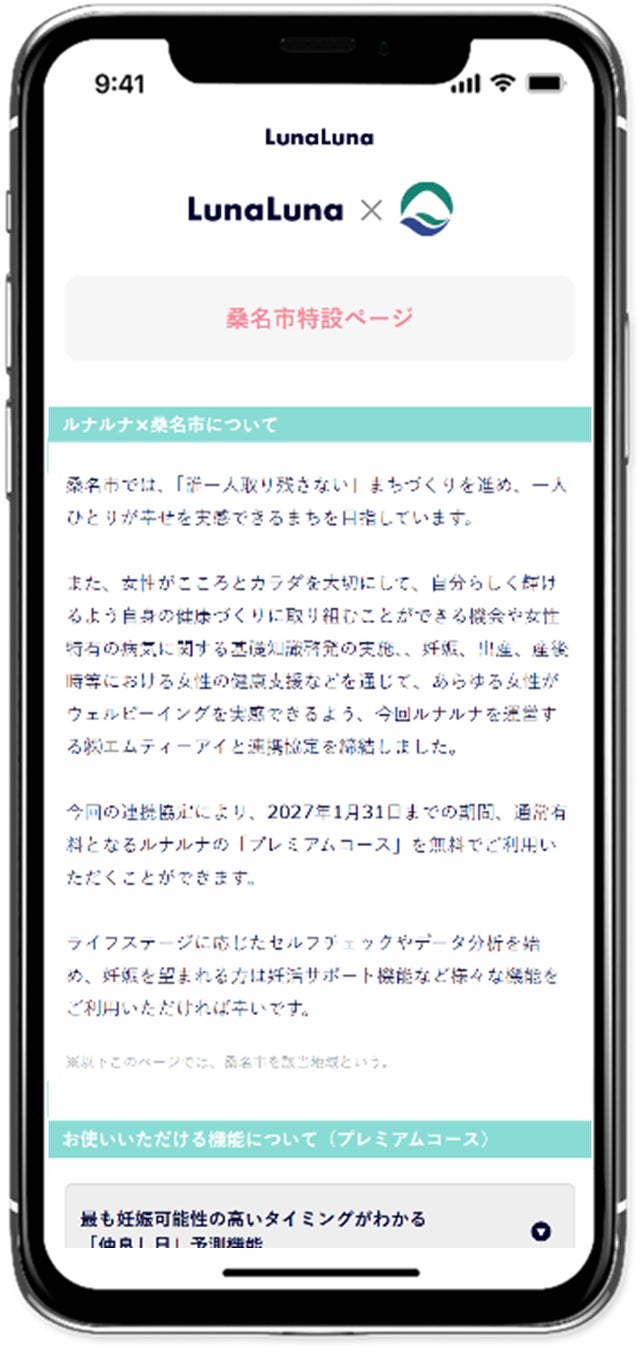 本連携協定により、桑名市の住民に対し、すべての女性の一生に寄り添うウィメンズヘルスケアサービス『ルナルナ』の有料機能である「プレミアムコース」の無償提供を開始します。『ルナルナ』のサービスを通じて、不妊治療や妊活に関する基礎知識などの情報配信も予定しており、利用者はライフステージに合わせた健康情報を受け取ることができます。