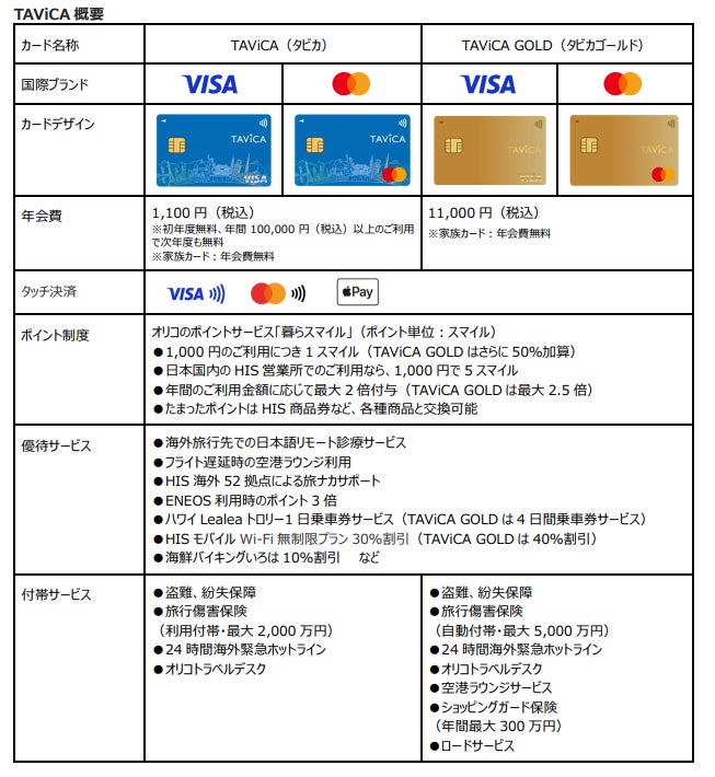 オリコ提携カード「Skywalker Card」は、HISでお支払いいただくとポイントが5倍でたまり、たまったポイントはHIS商品券に交換できるなど、HISをご利用されるお客様にとってお得なクレジットカードです。このたび、「Skywalker Card」をリブランディングし、「TAViCA」(読み方:タビカ)としてカードデザインを一新し、旅ナカの優待サービスを新たに追加し、12月20日(金)より開始いたします。