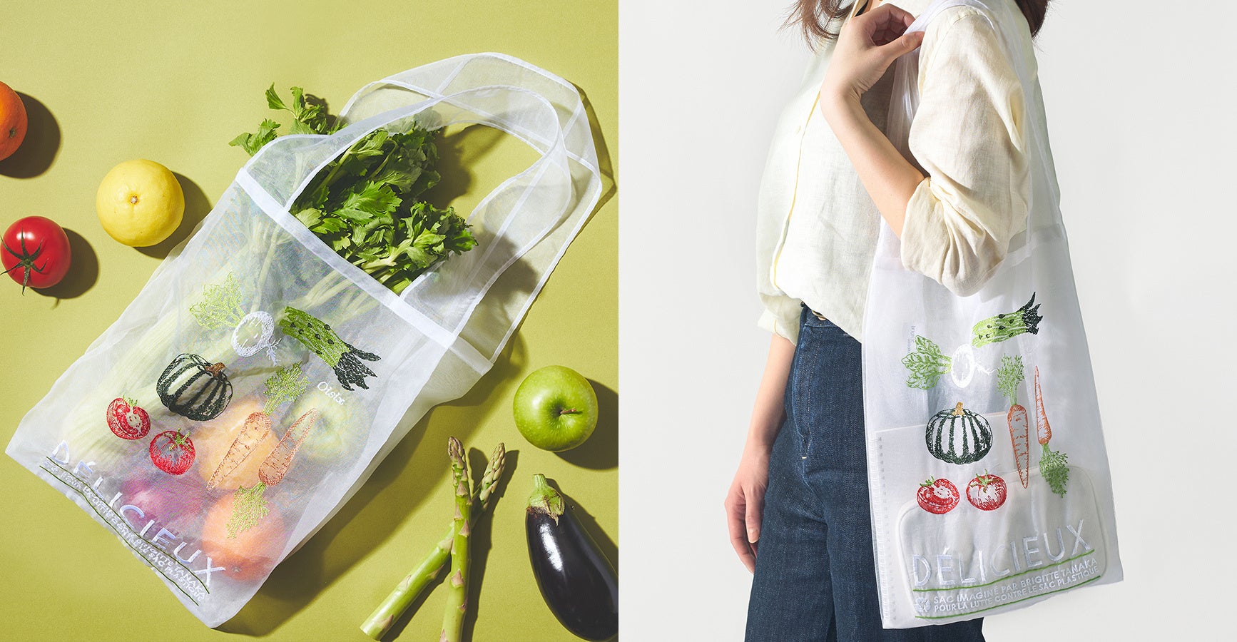 Brigitte Tanakaのアイコンであるオーガンジーバッグは、「使い捨てのプラスチック袋の代わりに、普段のお買い物で長く使って欲しい」という想いから誕生しました。Oisixも、食品ロス削減への取り組みなどを通じて「豊かな食卓を次の世代へつないでいきたい」という考えを持っており、両者のサステナブルな価値観が共鳴したことで、今回のコラボレーションが実現いたしました。