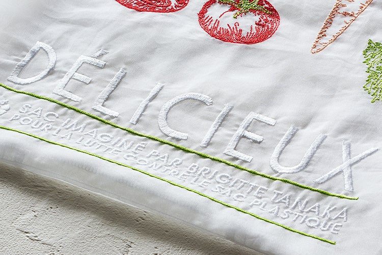 バッグ下部に施した「DÉLICIEUX(おいしい)」のテキスト刺繍は、あえて白地に白い糸で表現しています。主張しすぎない落ち着いたトーンに仕上げることで、年齢を問わず幅広い方に日常のコーディネートとして楽しんでいただけるようにこだわりました。