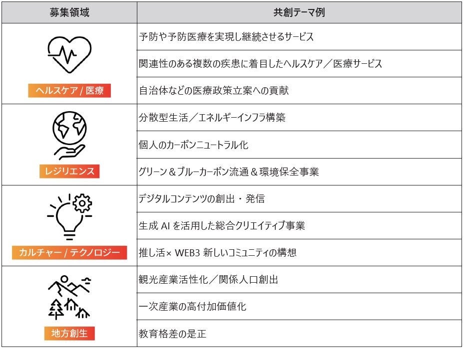 このたびスタートする「spark.meアクセラレーションプログラム」は、これまで培ってきた社内起業プログラムのノウハウを活かし、対象を社員とスタートアップ企業へ広げ、新たな価値創造を目指すプログラムです。募集テーマは、①ヘルスケア・医療②レジリエンス③カルチャー・テクノロジー④地方創生の4つを予定しています。
