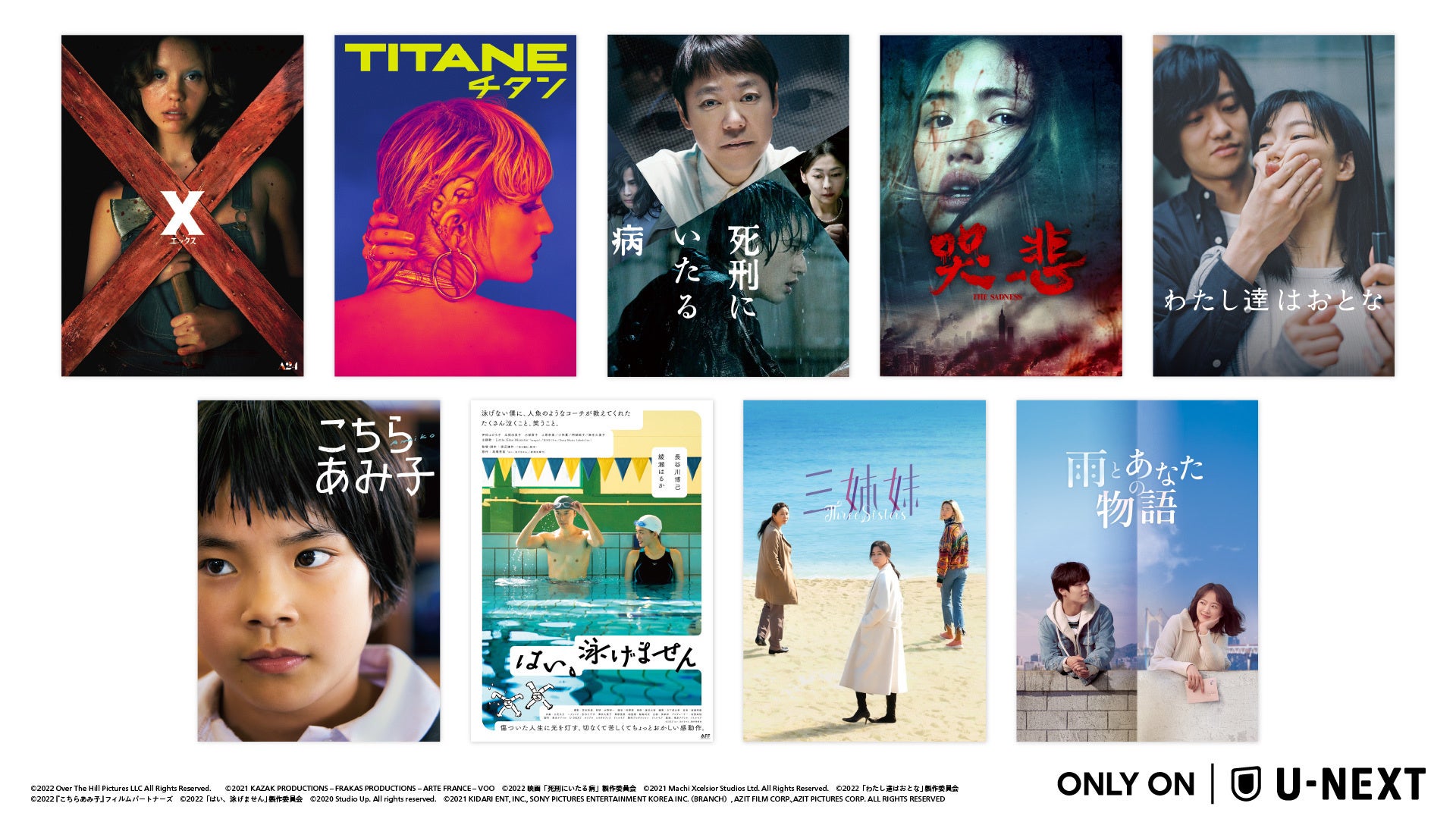 USEN-NEXT GROUPの株式会社U-NEXT(本社:東京都品川区、代表取締役社長:堤 天心)が運営する動画配信サービス「U-NEXT」は、10月に『死刑にいたる病』『哭悲/The Sadness』『はい、泳げません』『わたし達はおとな』『雨とあなたの物語』『TITANE/チタン』『こちらあみ子』『X エックス』『三姉妹』を独占配信いたします。