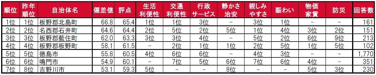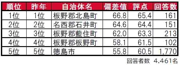住みここちは2年連続で、1位板野郡北島町、2位名西郡石井町、3位板野郡藍住町。