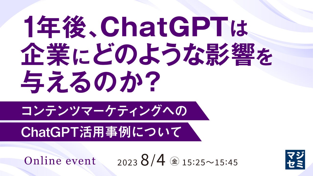 業界の第一線で、実際にChatGPTなどの生成AIを活用している企業をゲストとしてお迎えし、マジセミ代表の寺田とともに、「1年後、ChatGPTは企業にどのような影響を与えるのか?」というテーマで対談を行います。