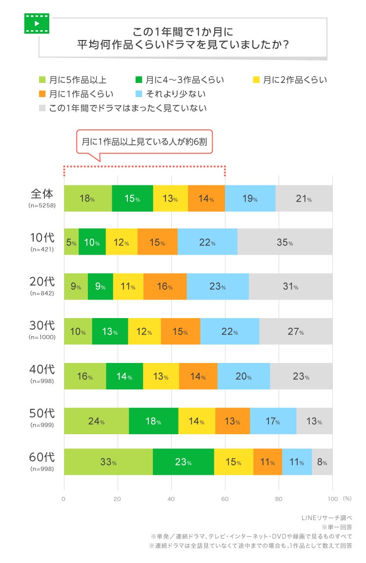 LINEリサーチ、全国の10~60代の男女を対象に、1年間でドラマをどのくらい見ていたかと好きなドラマのジャンルに関する調査を実施