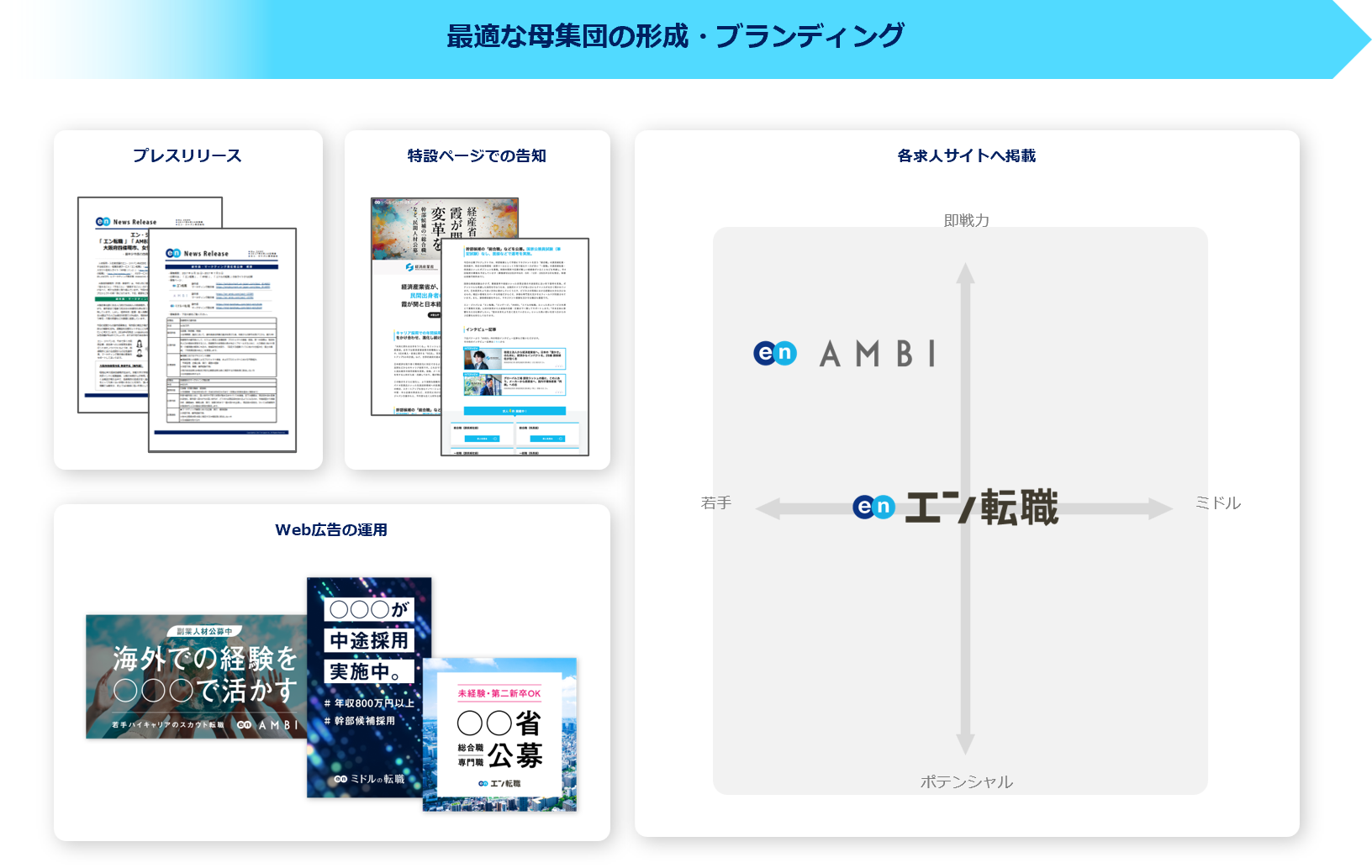 プレスリリースや特設ページ、Web広告での告知に加え、各求人サイトでの集客支援を実施。『AMBI』『エン転職』とターゲットの異なる求人サイトを活用することで、ターゲットへ網羅的に求人を届けます。