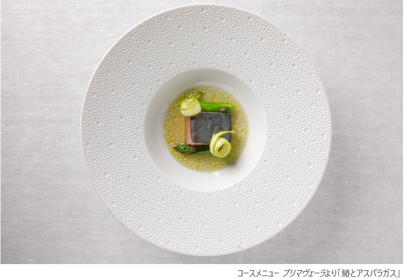 エグゼクティブシェフ ルカ・ファンティンがこの時期コースメニューで描くのは、眠りから覚めた生物が再び活動を始める、まさに生命力あふれる春の躍動感を、香り、味、色彩で伝えるその名も「プリマヴェーラ」です。その力強さをもっとも表現しているのは「鰆とアスパラガス」です。― 駿河湾を泳ぎ周り、淡白さと上品な甘みをもった鰆を炭火で炙ります。スモーキーな香りを十分に纏い、テーブルまで運ばれた鰆は、トマト、オリーブ、ケッパーなど地中海の野菜やハーブで作った自家製のブロードを注がれ、お皿の上で再び色味も鮮やかに蘇ります。 春風のようなさっぱりとした味わいのひと品です。一方、芽吹きの春を伝えるお料理は、ホワイトアスパラガスを使ったリゾットです。「北イタリアの地中で力強く育ったホワイトアスパラガスは野性味に溢れ、苦みがあります。それを食べると幼少期の春を思い出します」とルカ・ ファンティンは語ります。敢えて苦みのある国産ホワイトアスパラガスと甘味が凝縮されたホワイトアスパラガスの2種を使い、バランスのとれたうま味を感じるリゾットで北イタリアの春の恵みを美しく再現します。