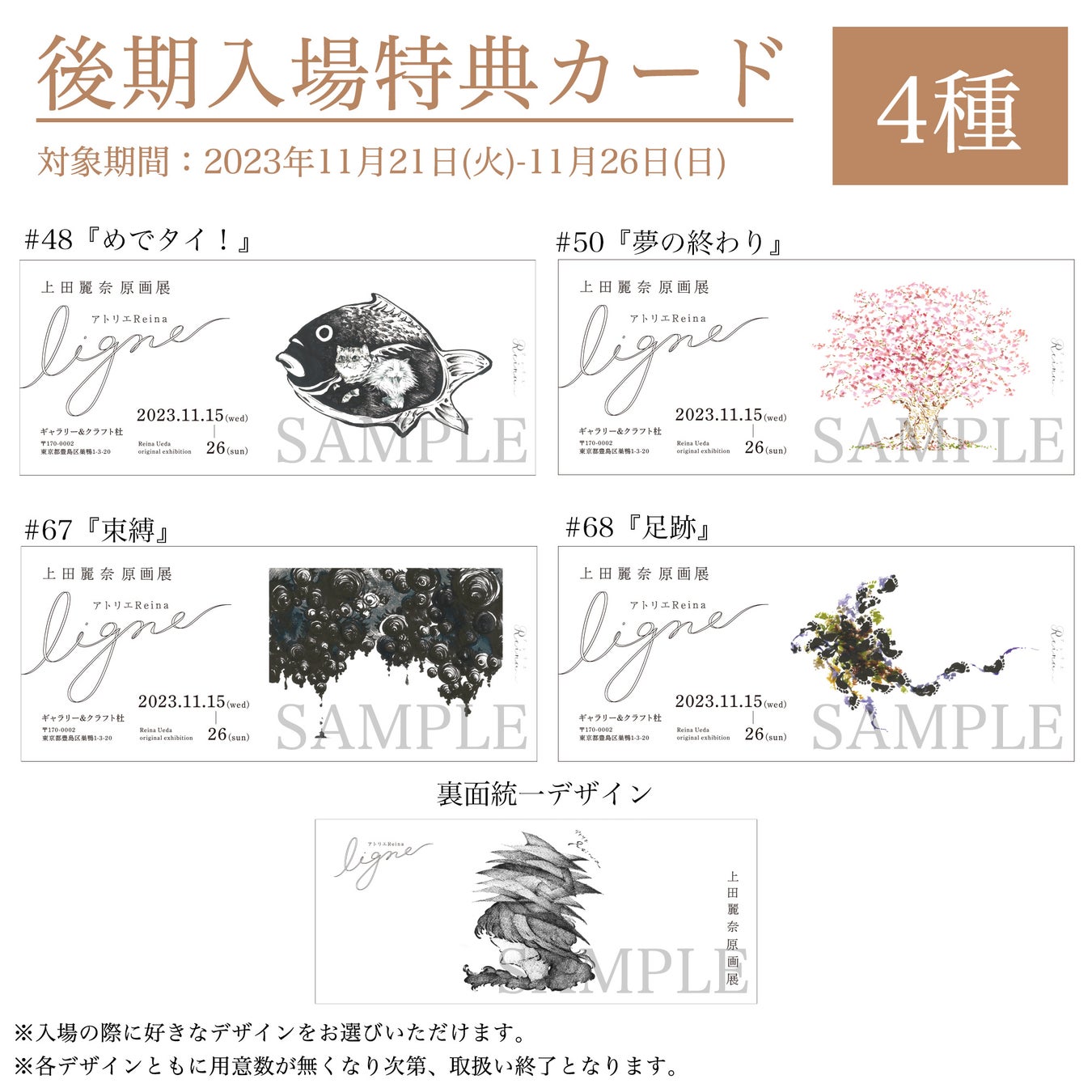入場チケットが10月下旬より販売開始予定。本展示は前・後期の2期制となり、展示イラストに加えて音声ガイドも異なる内容となる。そして、来場者特典として、選べる特典カードを1枚プレゼント!