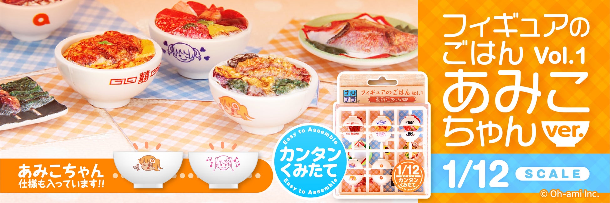 大網株式会社(本社・東京都文京区)は、株式会社エムアイシーが発売しています人気の1/12スケールフィギュア向けのミニチュアフードの組立キット『フィギュアのごはん』シリーズに、自社が運営するホビーショップ「あみあみ」のイメージキャラクター『あみこ』のイラストが印刷された、『フィギュアのごはん Vol.1 あみこちゃんver.』を発売いたします。