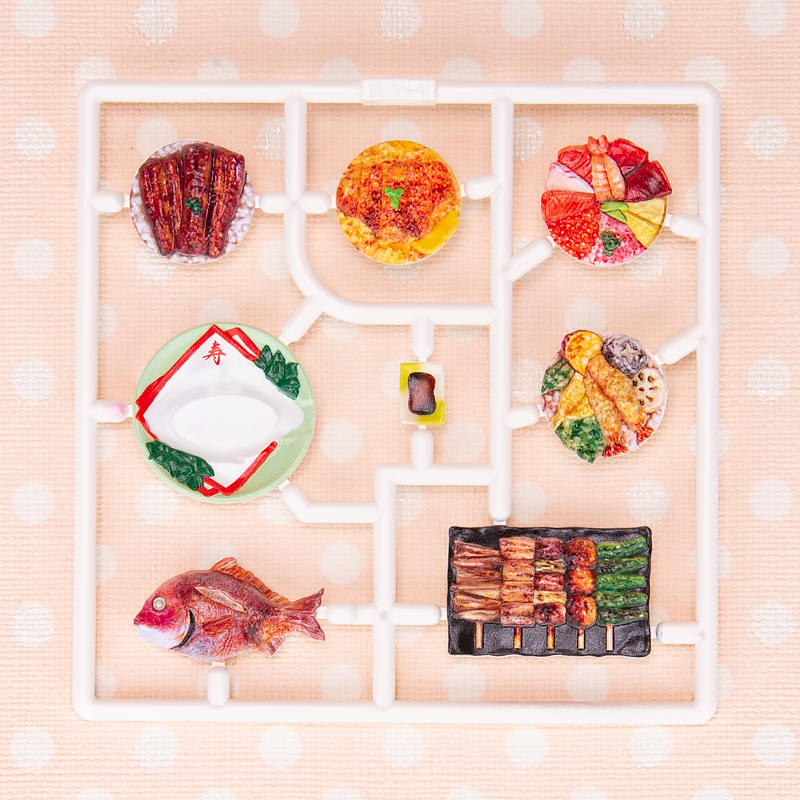 - 『フィギュアのごはん』は、1/12スケールフィギュア向けのミニチュアフードの組立キットで、ランナーからニッパーで切り出して簡単な組み立てで完成します。