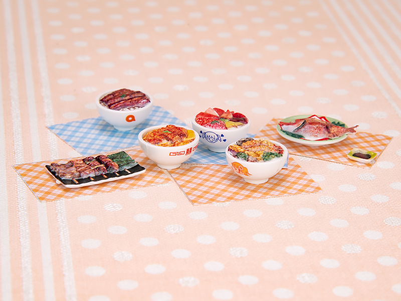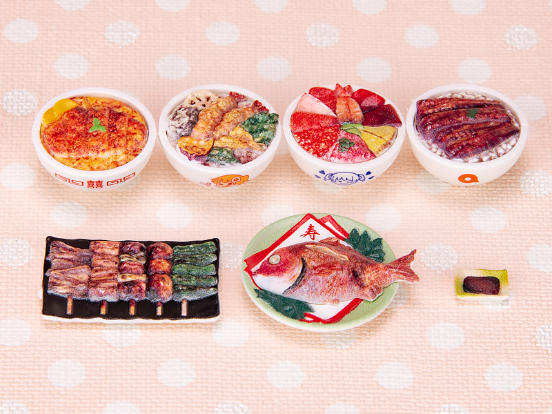 あみこちゃんどんぶりと合わせて、鯛の尾頭付き、焼き鳥盛合わせ、かつ丼、うな丼、天丼、海鮮丼(醤油皿付き)も収録されています。