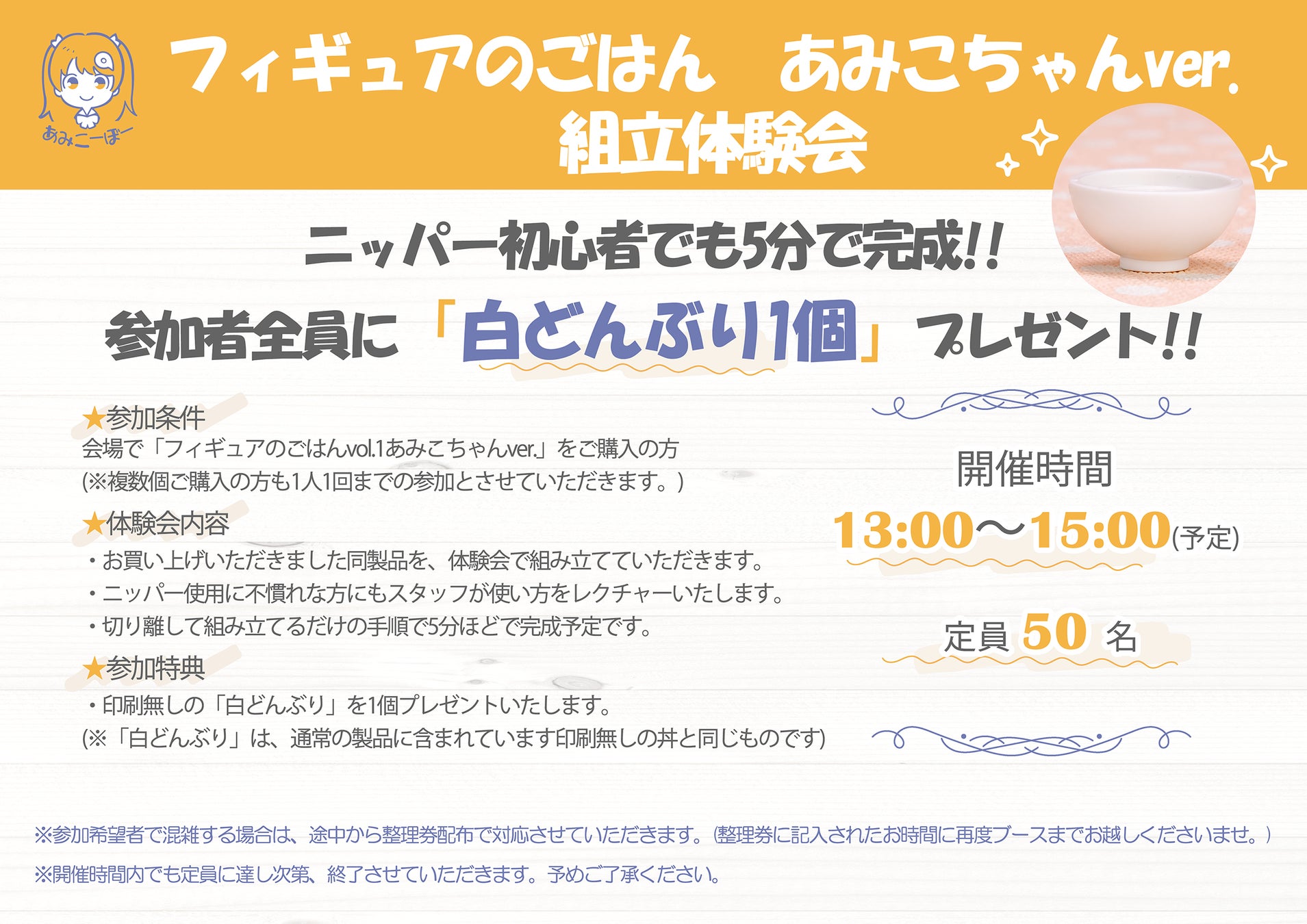 当日は、6月13日発売予定の『フィギュアのごはん Vol.1 あみこちゃんver.』をちょっとだけ先行販売。会場で『フィギュアのごはん Vol.1 あみこちゃんver.』をご購入の方を対象にした、組立体験会です。