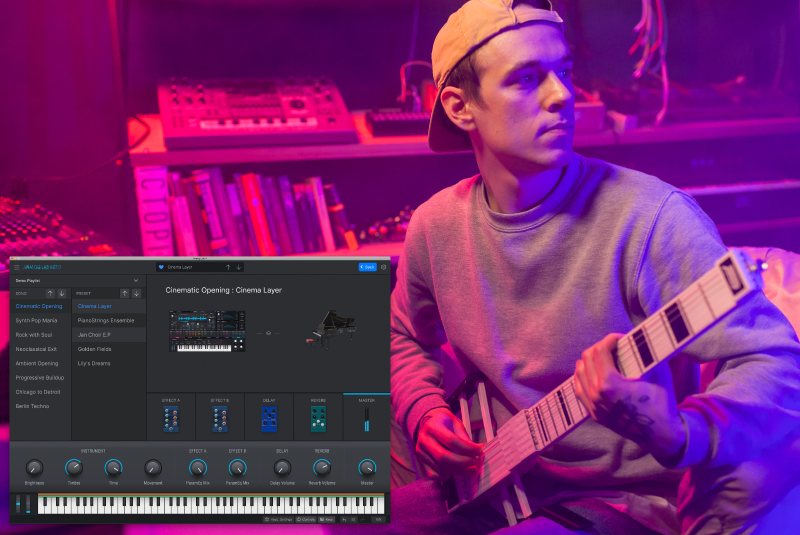 この「Arturia Analog Lab Lite」を「Jammy E」と一緒に使えば、鍵盤の弾き方を知らなくてもギターの演奏方法で理想の音を作り出すことが可能。