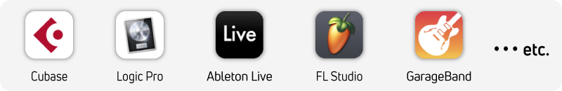 Cubase、Logic Pro、Ableton Live、FL Studio、GarageBandなど、Windows、Macにかかわらず、どんなソフトとも一緒に使うことができます。