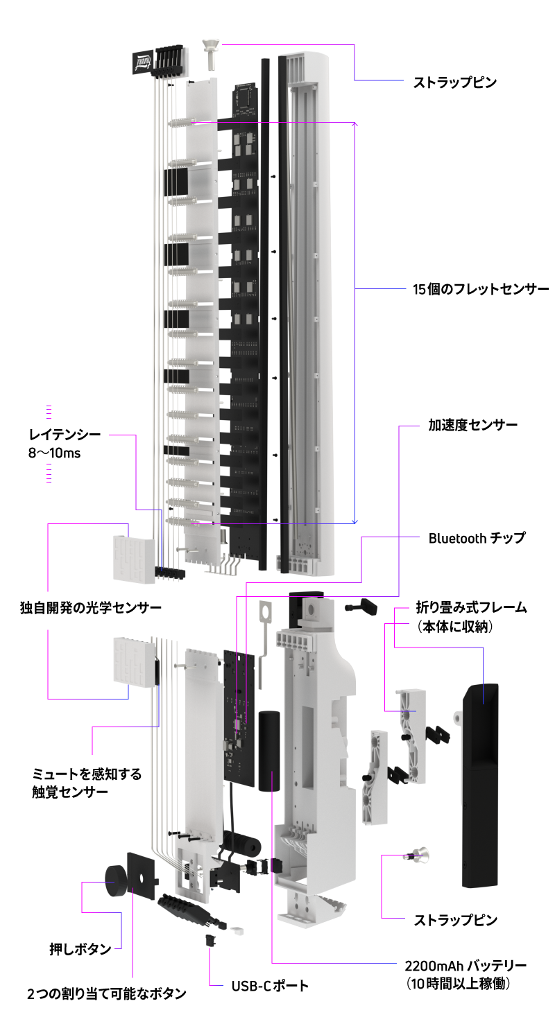 独自の光学センサーと機械的ソリューション、およびiOSとAndroid用のコンパニオンアプリを搭載した前モデルである「Jammy G」はクラウドファンディングで大きな成功を納めた後も、日本をはじめ、世界中のギタリストに愛用されています。