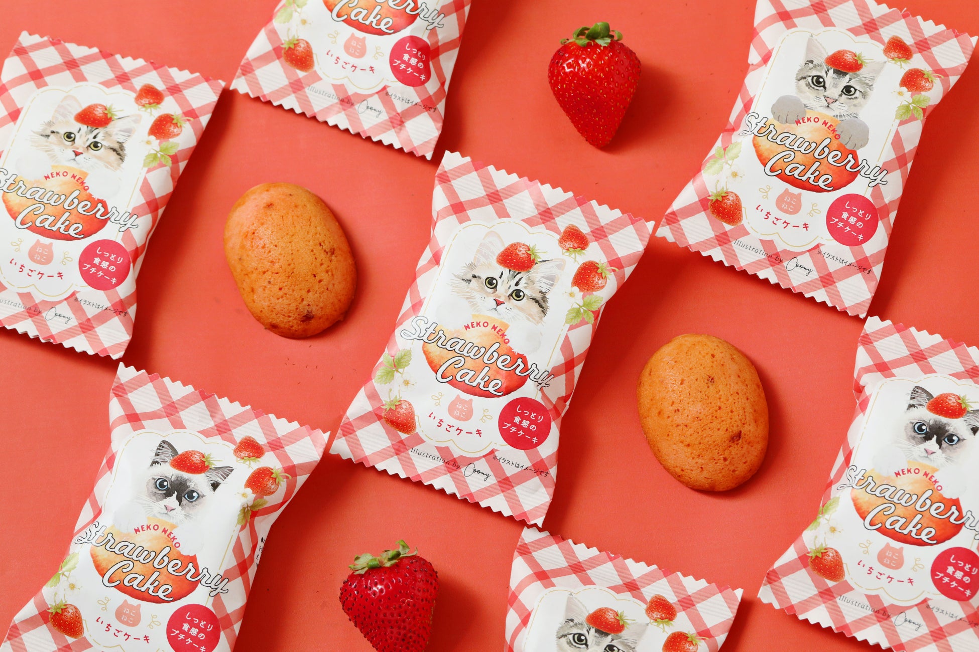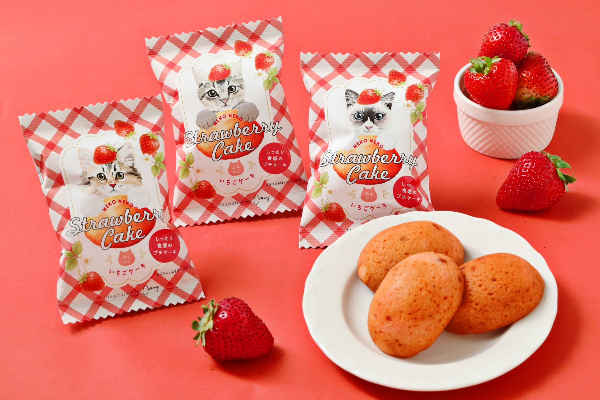 2025年12月1日(月)より期間限定で『ねこねこいちごケーキ』を新発売いたします。いちごジャムを使用し、ふんわりしっとりと焼き上げた冬の新作スイーツです。パッケージは、猫専門イラストレーターCoony(クーニー)さんが描いた、あどけなさが残る“こねこ”の愛らしい姿をデザインしました。