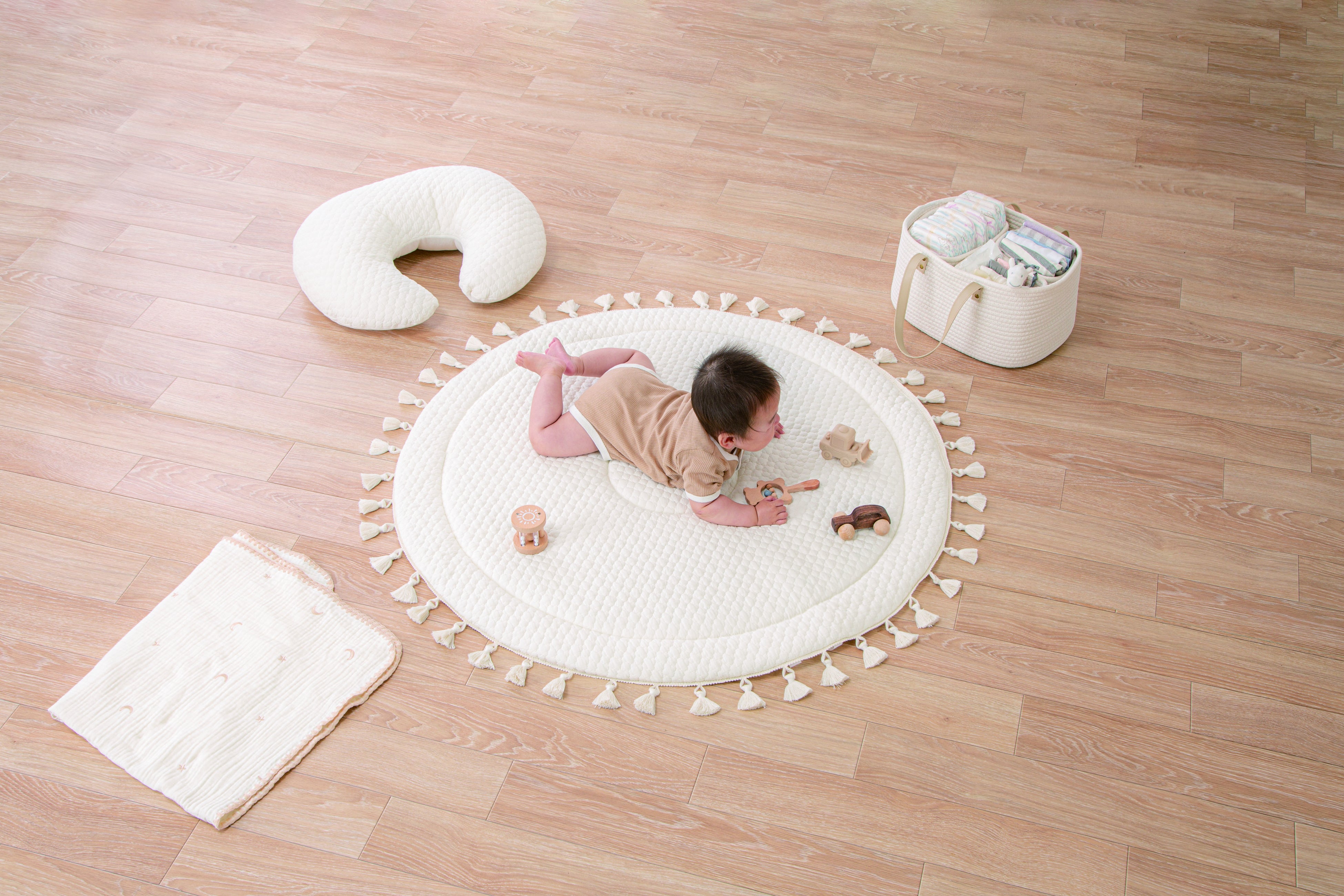 フリンジ付きのかわいらしいサニーマット、授乳クッション、お昼寝マット、抱っこ布団、花形枕、フリル付き枕の6点を取り揃えております。表生地は綿100%、やさしい肌触りになっています。