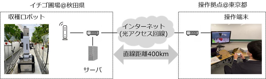 システム構成として、秋田県のイチゴ圃場に収穫ロボットと画像処理用サーバを設置し、東京都の拠点に操作端末を配置しました。両拠点は直線距離で約400km離れており、光アクセス回線とインターネット回線で接続されています(図1)。この環境で、収穫ロボットを遠隔から精度高く操作し、イチゴを傷つけずに収穫できることを確認しました。