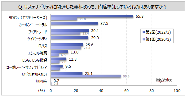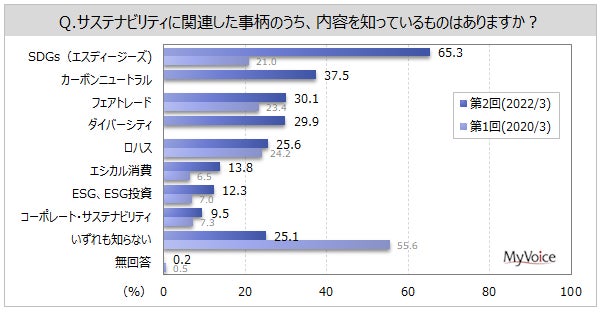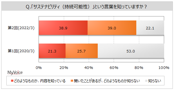 マイボイスコム株式会社(東京都千代田区、代表取締役社長:高井和久)は、インターネット調査を中心に提供している伊藤忠グループのリサーチ会社です。この度、2回目となる『サステナビリティ(持続可能性)』に関するインターネット調査を2022年3月1日~5日に実施し、10,003件の回答を集めました。調査結果をお知らせします。