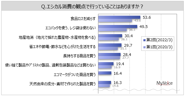■エシカル消費の観点で行っていることは、「食品ロスを減らす」が5割強、「エコバックを使う、レジ袋は使わない」が5割弱。2020年調査と比べて、「食品ロスを減らす」「エコバックを使う、レジ袋は使わない」が増加