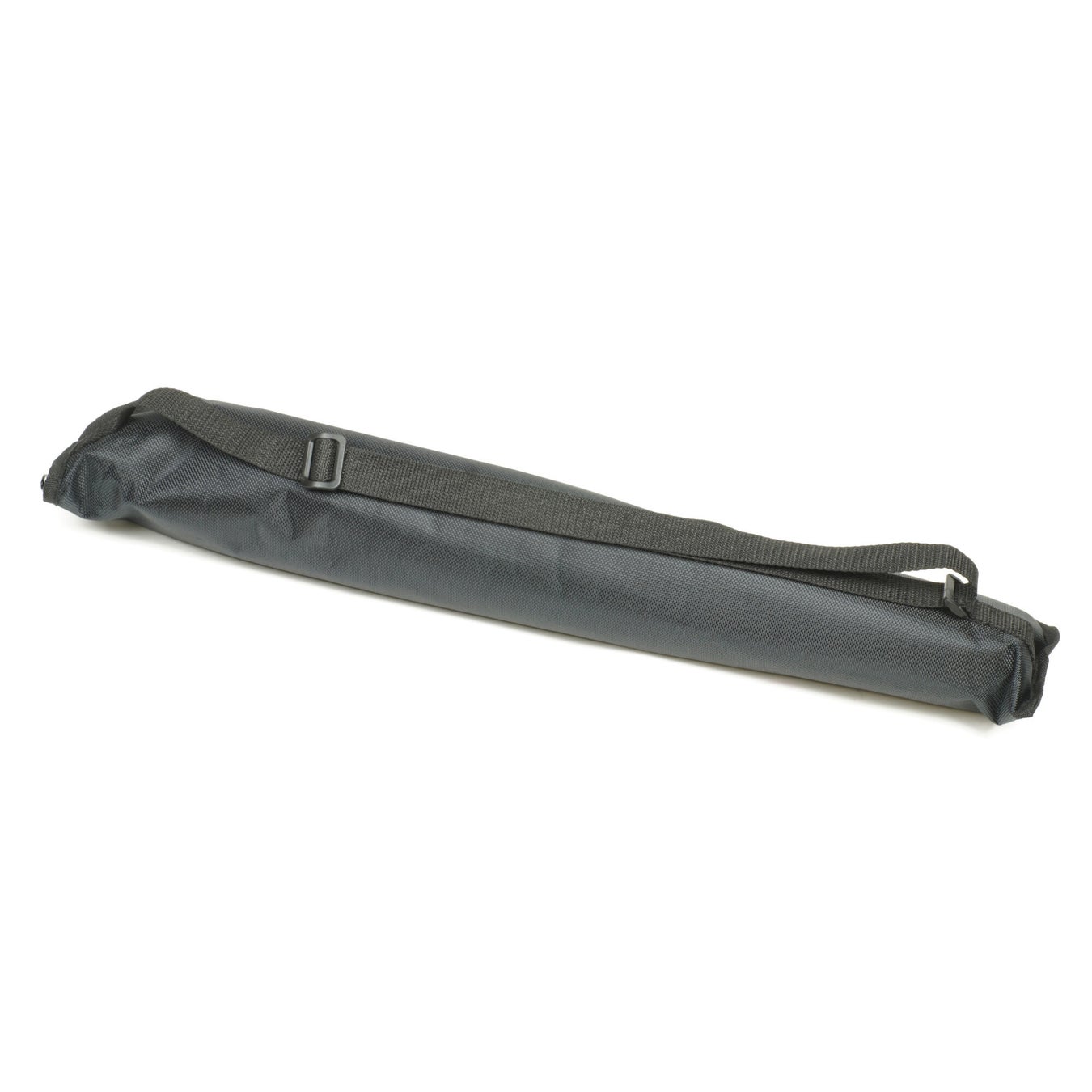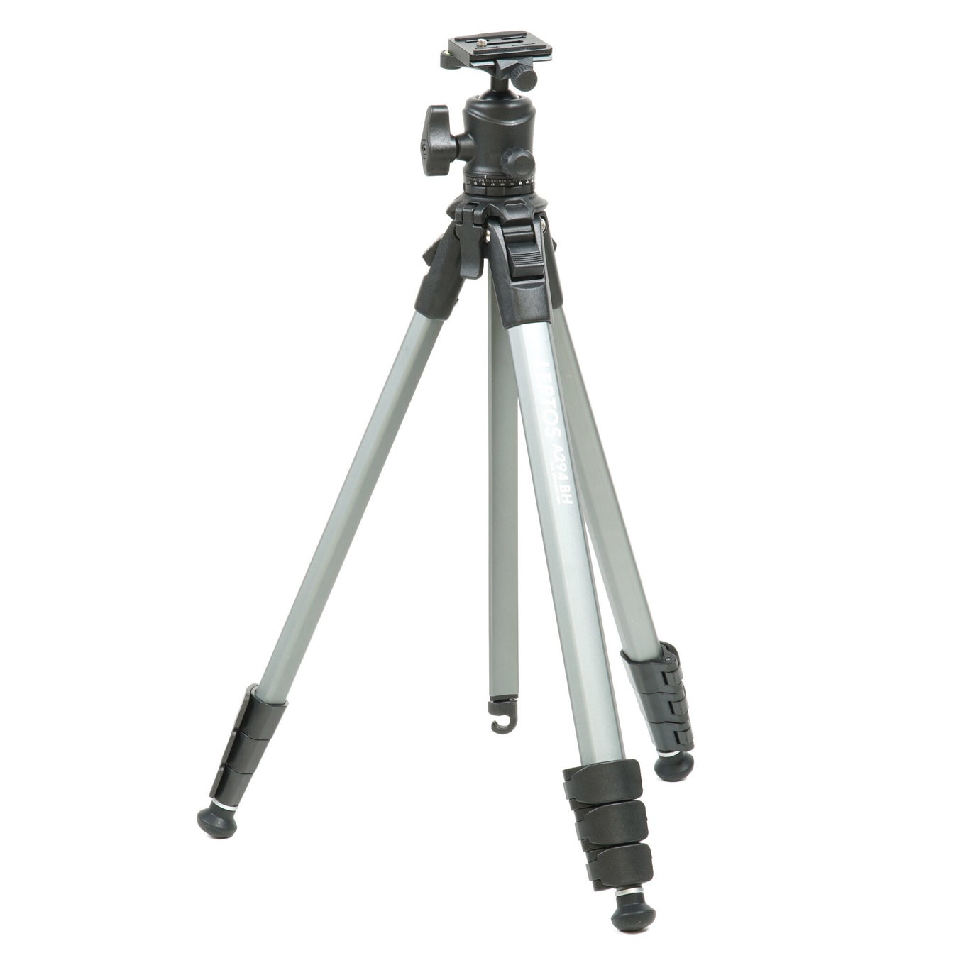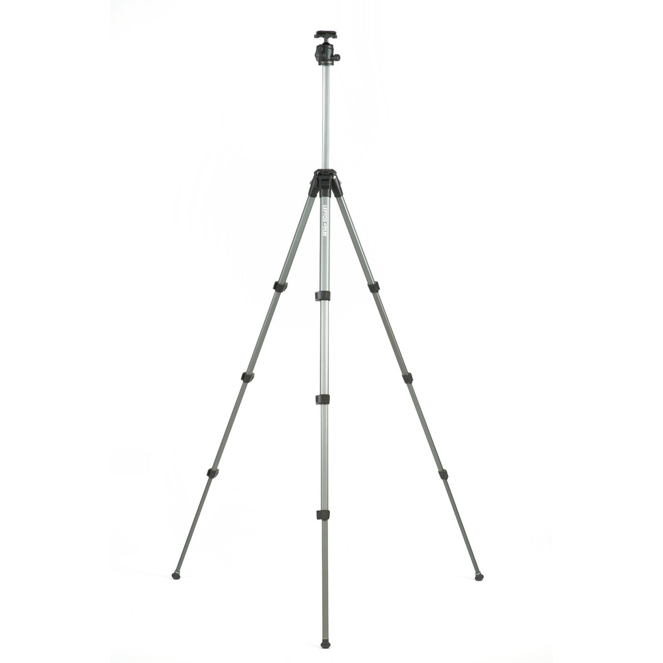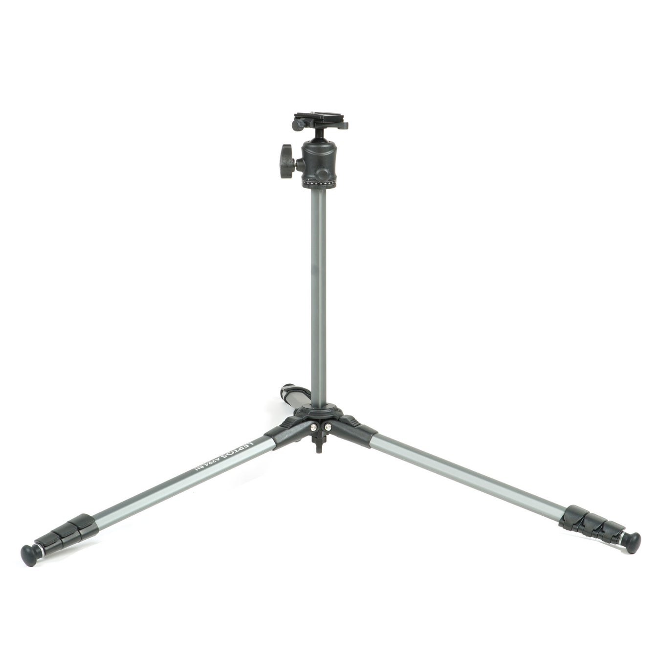 外径約66mmとスリムに持ち運べる軽量三脚です。 脚パイプは扇型のアルミ4段で、脚ロックはレバー式を採用しています。装備の雲台は、アルカ互換のクイックシューを採用した自由雲台を搭載。