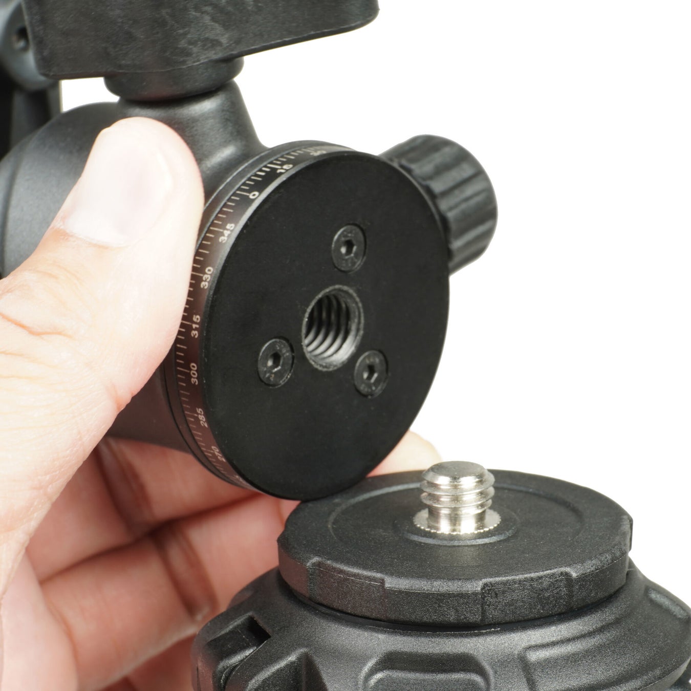 標準装備の自由雲台は取り外し可能で、取り外すとU3/8インチ(大ネジ)が対応します。