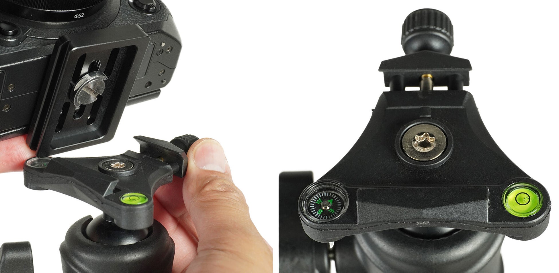 雲台には方位磁石と水準器を装備。ケースが付属します。