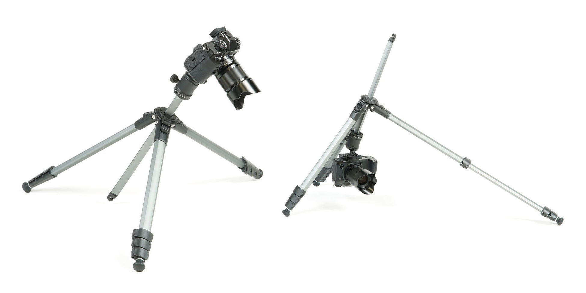 エレベーターは分割しない仕様ながら、開脚の工夫で俯瞰撮影にも便利。さらにエレベーターを逆さに差し込むことで、雲台を下側に配置すれば地面スレスレのローポジションも可能に。
