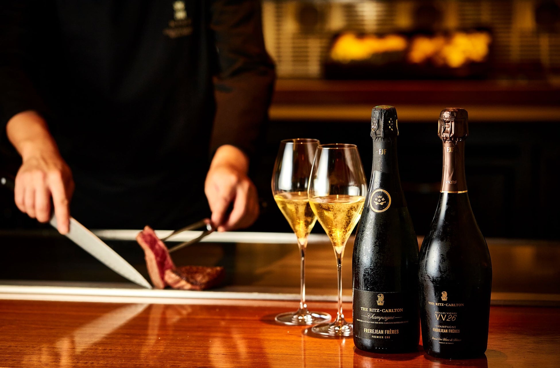日本のザ・リッツ・カールトン各ホテルで、ハウスシャンパンとして採用された「ブリュット プルミエ・クリュ」から始まり、「フレールジャン・フレール(Frerejean Freres)」と、沖縄の食材そのものの素材のうま味を引き出す、鉄板焼「喜瀬」とのマリアージュを存分にお楽しみいただけます。