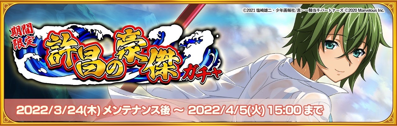 株式会社マーベラス(代表取締役社長 許田周一/所在地:東京都品川区)は、原作が20周年を迎えた大人気シリーズ「一騎当千」のAndroid/iOS向け新作ゲームアプリ『一騎当千エクストラバースト』で、2022年3月24日(木)から、「バーストフェス」、及び、バーストフェス開催の記念イベントを開始したことをお知らせいたします。