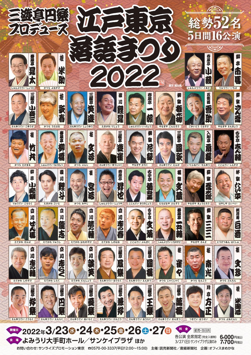 日本の伝統芸能のひとつで、江戸文化の象徴でもある落語を東京から発信する「江戸東京落語まつり2022」(産経新聞社、読売新聞社主催)を開催します。『笑点』などでおなじみの三遊亭円楽をプロデューサーとし、3月23日(水)~27日(日)の5日間、よみうり大手町ホール、サンケイプラザ、有楽町よみうりホール、丸ビルホールの4会場を舞台に、計16公演が行われます。出演は、東西総勢52人の落語家が大集合。チケットはあす10時から一般販売を開始します。人気と実力を兼ね備えた噺家たちの競演にご注目ください。