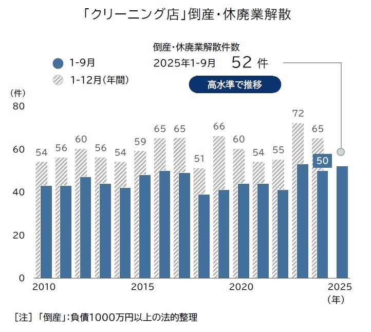 2025年1-9月に発生したクリーニング店の倒産は18件、休廃業・解散は34件で、合計52件が市場から退出した。テレワークの普及に加え、オフィスウェアのカジュアル化、家庭用洗濯機の高機能化といった要因が重なり、クリーニング需要の減退が続く。資材高など運営コストも上昇したが、客離れを危惧して十分な価格改定に踏み込めず、業績が悪化するケースが増えている。