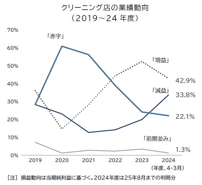 実際に、クリーニング店の2024年度(2024年4月~25年3月期)における業績をみると、「減益」となった事業者が3割を超えたほか、「赤字」も2割を占め、全体の半数超が業績悪化となった。クリーニング店の多くが、ドライクリーニング用の洗剤のほか、ハンガーや包装用ビニールなどの資材、ボイラー用燃油の価格高騰に直面した。また、慢性的な工場作業員の不足を背景とした給与水準の引き上げも行ったことで、多くの企業がサービス価格の改定を実施した。そのため客単価が上昇し、収入高は増収となったものの、価格改定だけでは上昇したコストを完全に吸収しきれず、「増収減益」傾向での推移となった。こうした環境のなか、創業から数十年が経過したクリーニング店などでは、店主の高齢化といった課題を抱える中で、洗濯機械の故障や設備更新のタイミングを機に事業を畳むケースも少なくない。