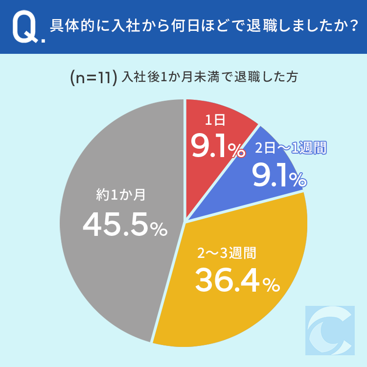 1か月未満で辞めた方のうち9.1%の方が「1日」で退職した、と回答しています。