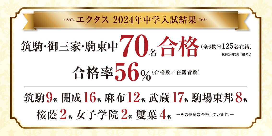 独自のカリキュラム・教材と指導方法に基づき、経験豊富な精鋭講師陣が授業を行います。2024年入試では在籍者の56%が筑駒・御三家・駒東中に合格する、群を抜いた『合格率』を誇っています。