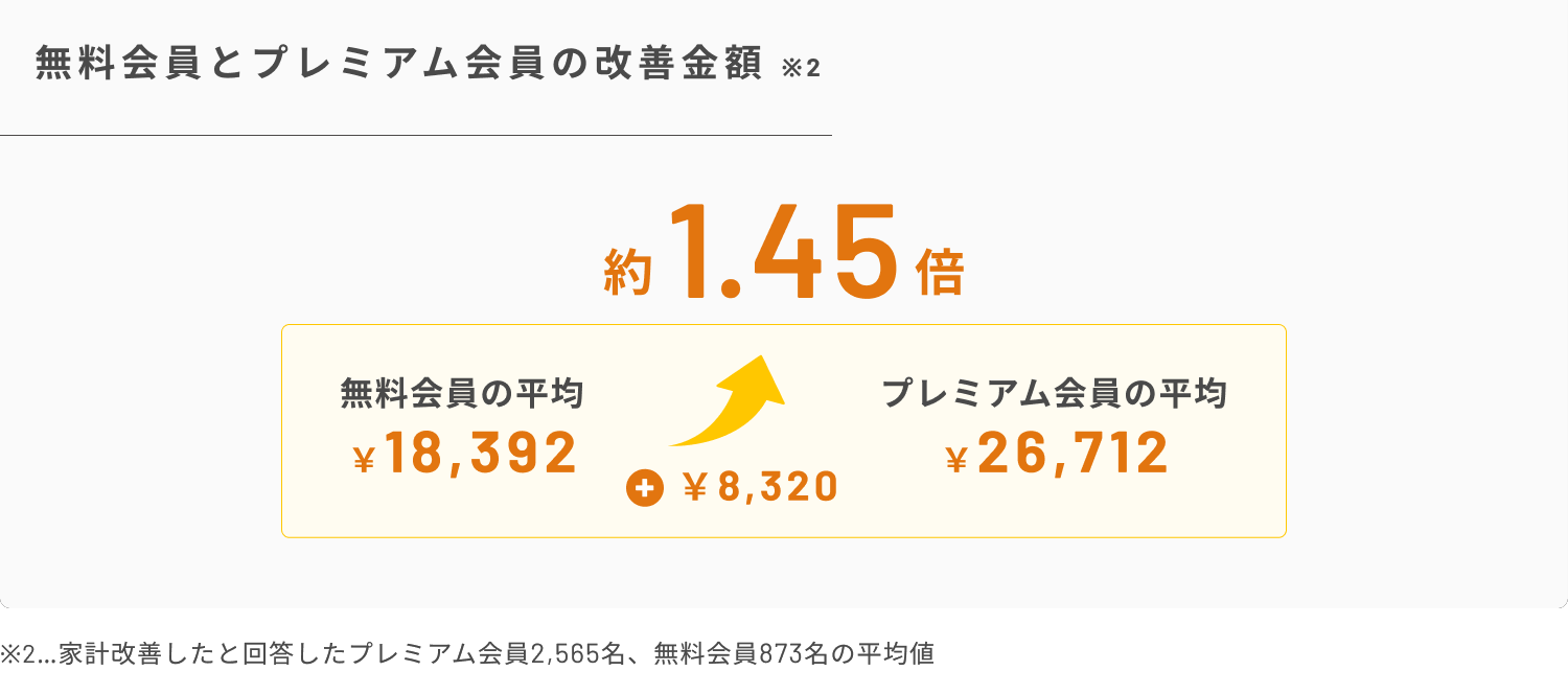 ・家計改善を実感した人の改善額は、平均で月24,599円。プレミアム会員(※1)は月26,712円で、無料会員の金額の約1.45倍。