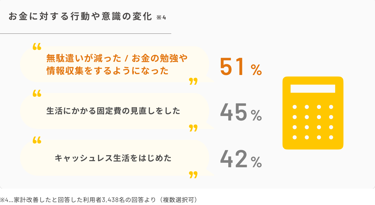 ・『マネーフォワード ME』利用して家計改善を実感したと回答している人のうち、「無駄遣いが減った」「お金の勉強や情報収集をするようになった」のは51%。