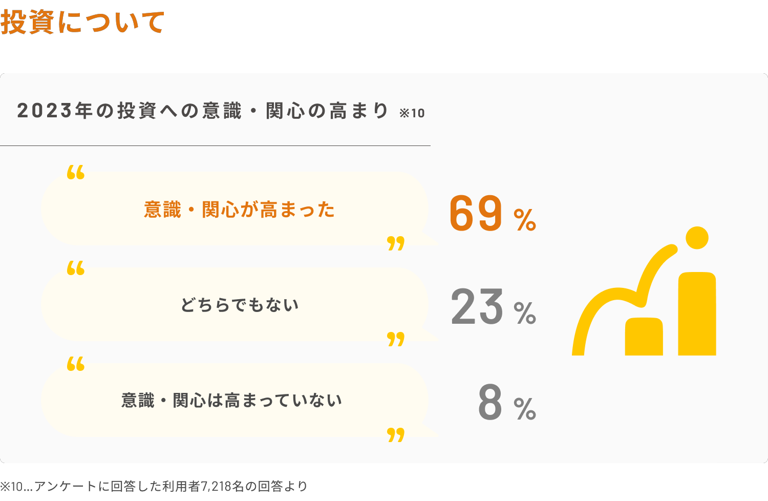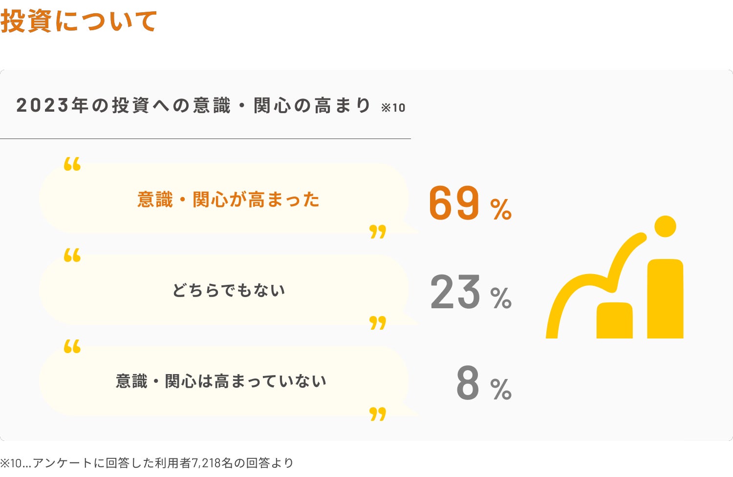 また、投資に関して、全体の69%が2023年を通して「投資に対して意識・興味関心が高まった」と回答。その理由として、意識・興味関心が高まった利用者の59%が新NISA制度の開始が影響していると回答しました。その他、冬のボーナスの使い道として「投資に回す」という回答が第1位にあがるなど、2023年の投資への意識の高まりが見られる結果となりました。