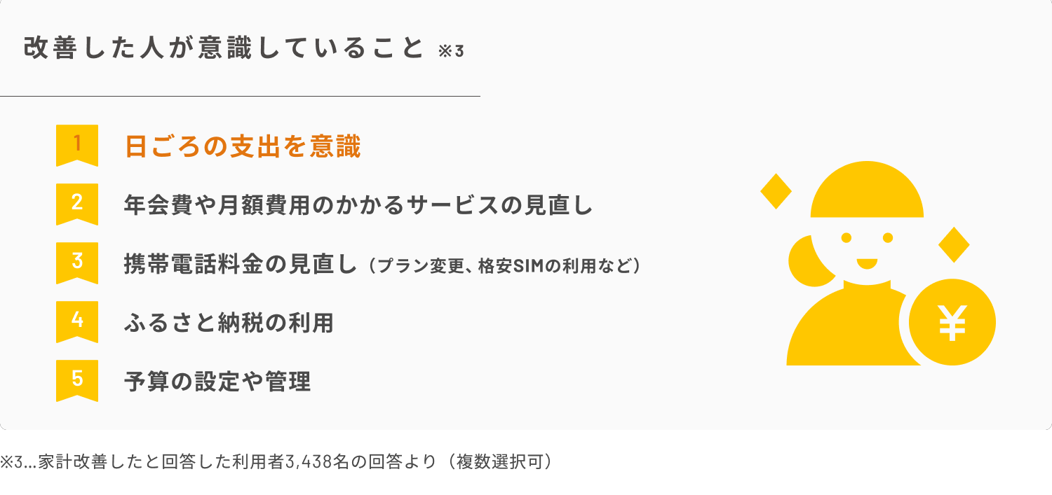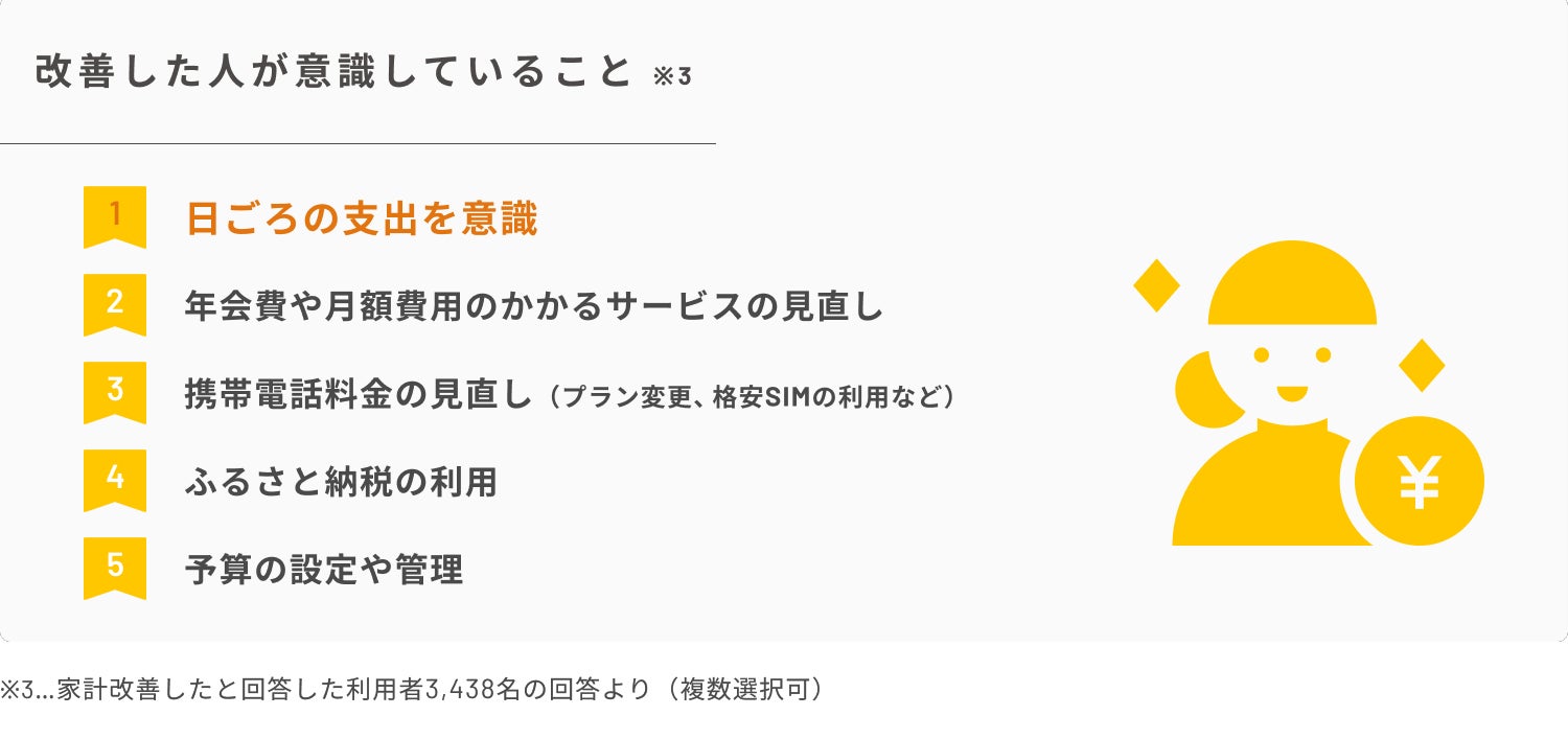・家計改善を実感した人が意識したことは、1位「日頃の支出」、2位「年会費や月額費のかかるサービスの見直し」、3位 「携帯電話料金の見直し」。