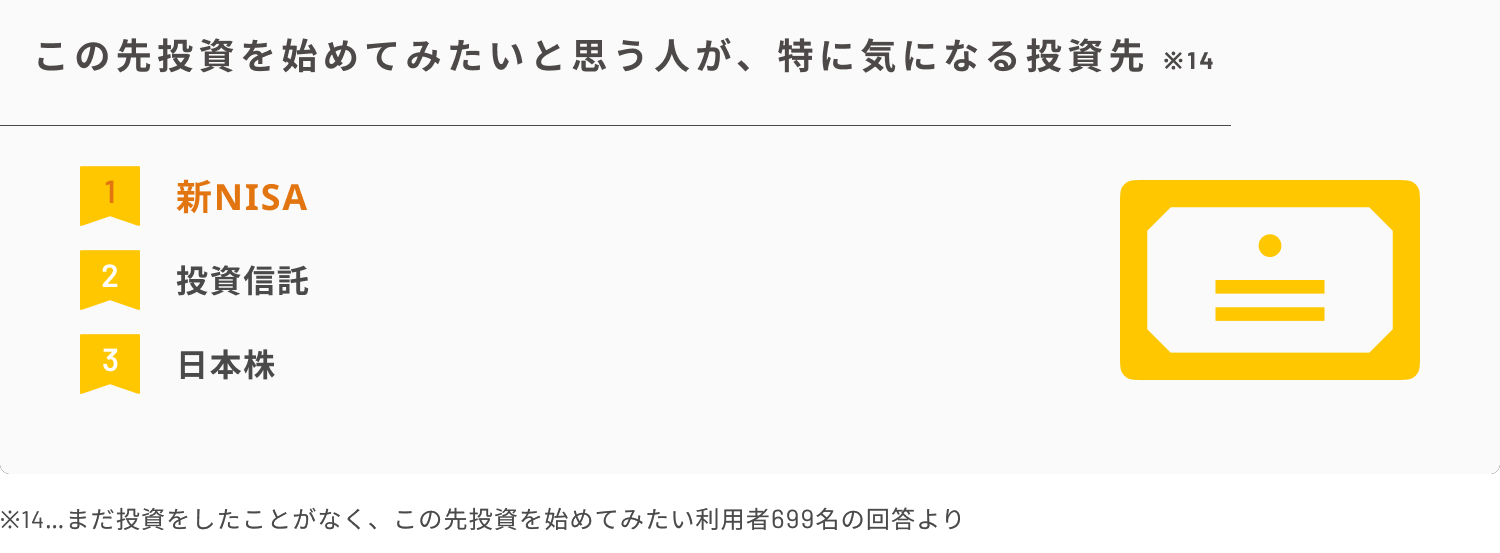 ・これから先投資を始めてみたいと考えている人が特に気になっている投資先は1位「新NISA」、2位「投資信託」、3位「日本株」。
