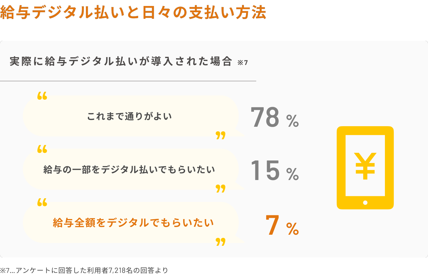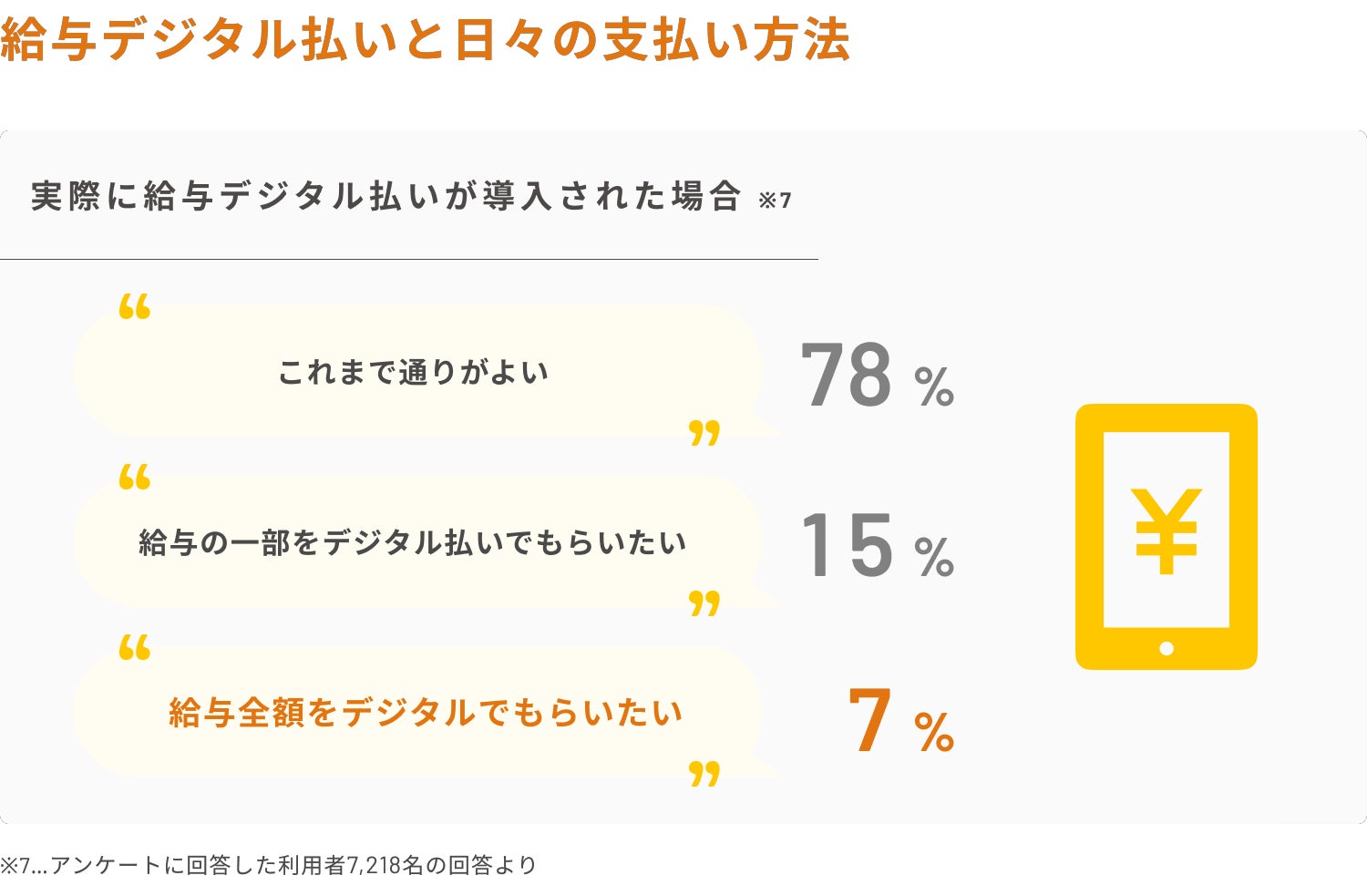 ・実際に給与デジタル払いが導入された場合、給与の全額をデジタルで貰いたいと回答したのは全体の7%。(2022年の同調査(https://corp.moneyforward.com/news/release/20221206-mf-press/)では全体の8%が全額をデジタルで貰いたいと回答。)